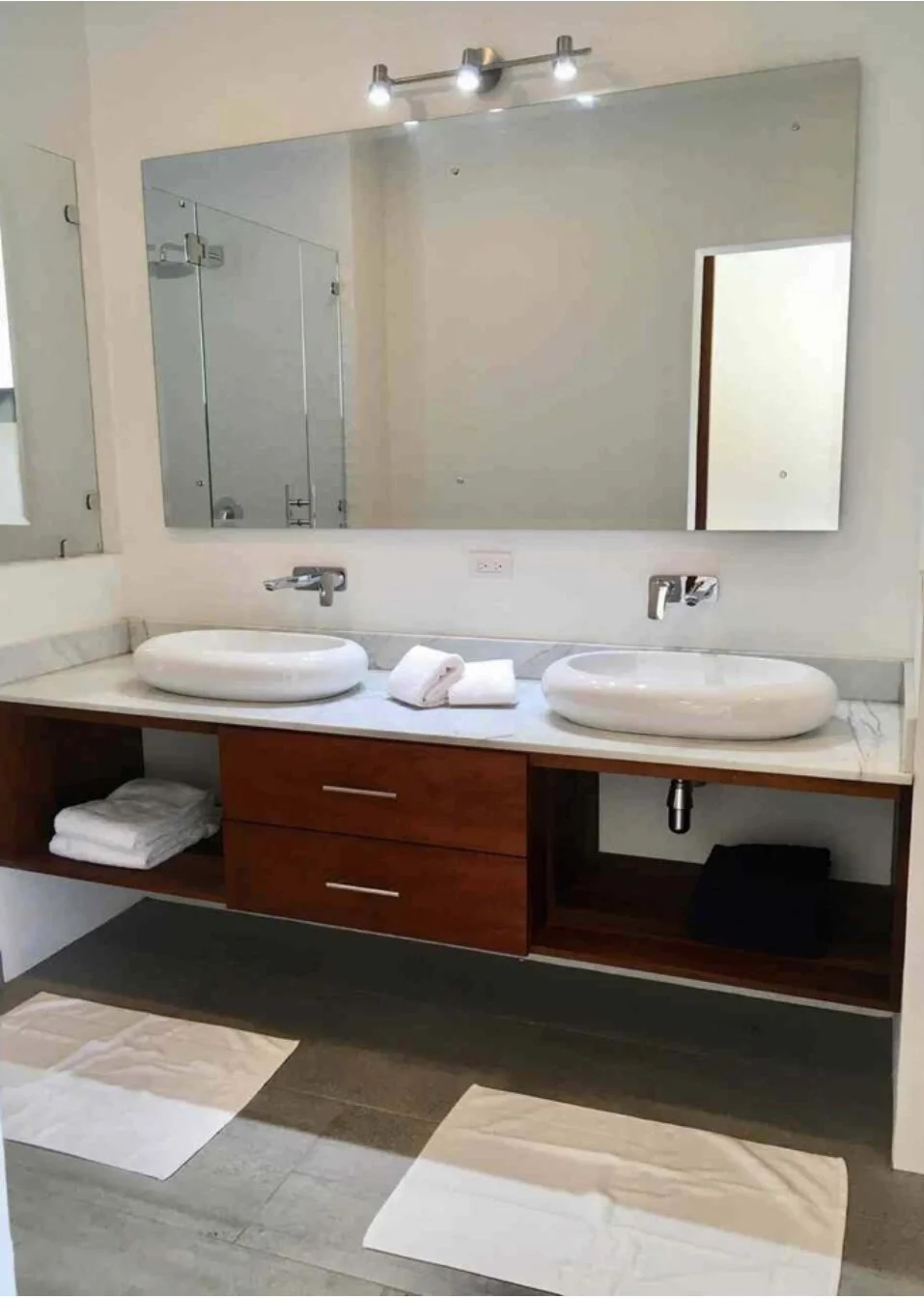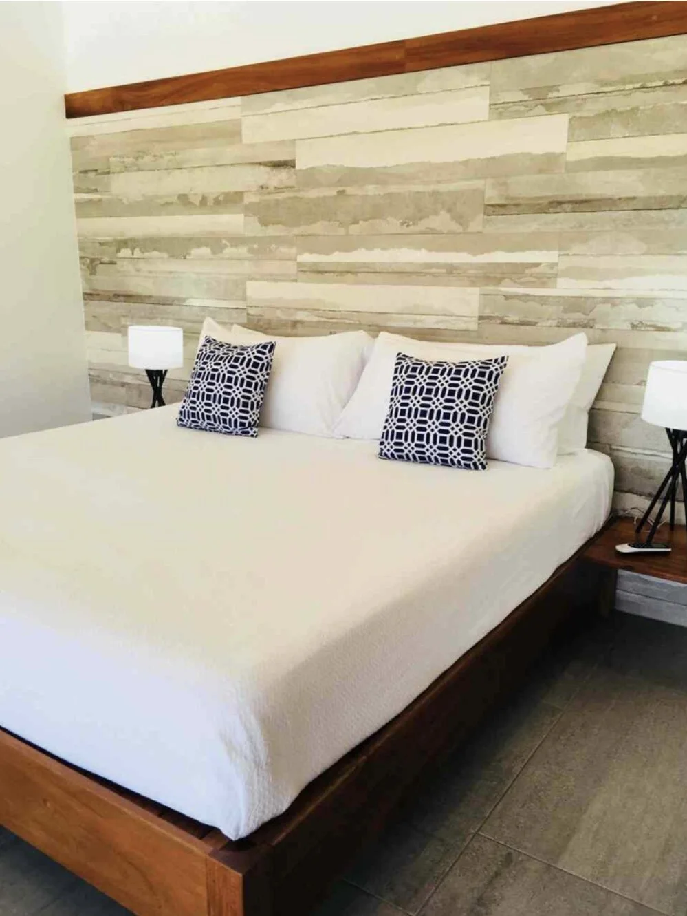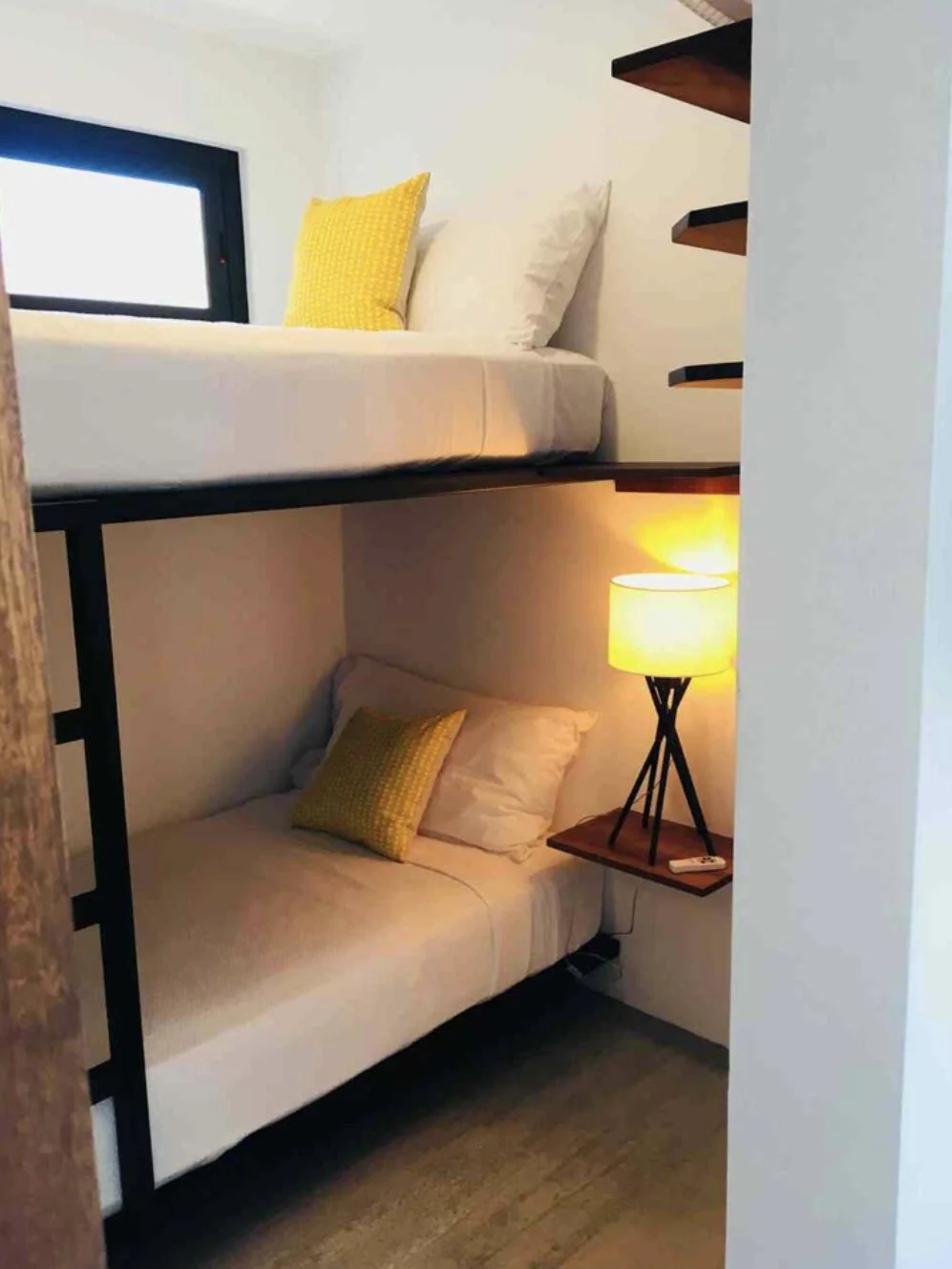 Two bedrooms both en-suite, bunk beds below and king upstairs, private swimming pool and shared off road parking. No wash or dryer but can be added onto the building outside.
